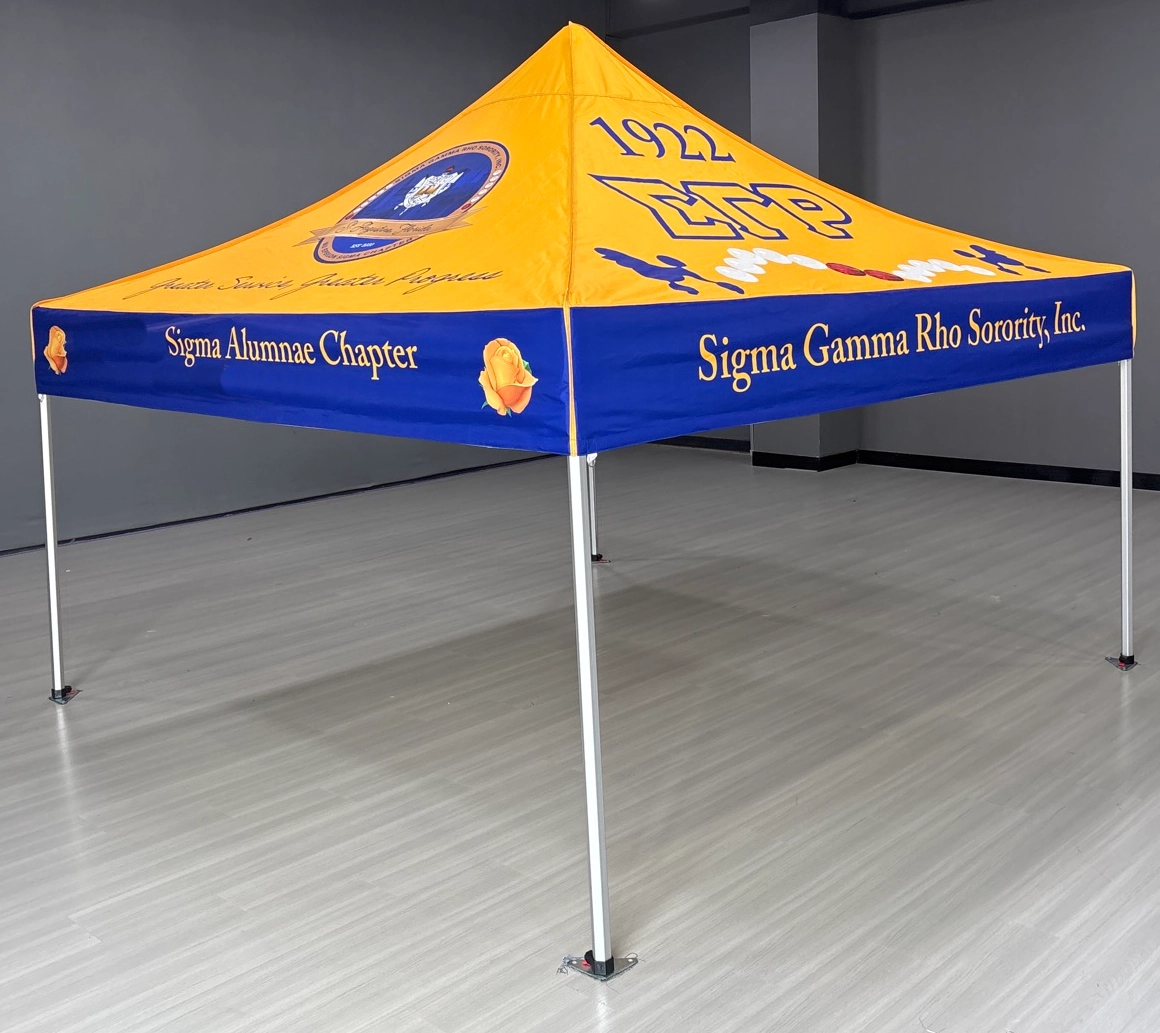 Ladies, you know you want the very best for yourselves and your Sorors! Purchasing a custom sorority tent is the perfect way to spread the message of “Greater Service, Greater Progress”! You deserve the best! You don’t have to stick with the design you see here. We can customize your design any way you would like – colors, names, logos etc. – the sky is the limit. Going to a tailgate, recruiting new members during rushes, and promoting your organization will be so much easier with a branded custom tent. Your sisters and brothers will really appreciate the shady place to sit during the fun. What a great opportunity to show off your brand and really let potential members get to know you. They will see that you care about a professional image and the details that are crucial! Our custom tents give you just that extra bit of real estate to list your services or even add contact information in plain sight. Our tents can be easily set up and transported to various locations like the aforementioned and also corporate events or picnics, trade shows and any other event. Not to mention it’s a great place to have a conversation in comfort and shelter from the elements. We can also customize vinyl banners, Step and Repeats and custom table cloths for tailgates and other events.